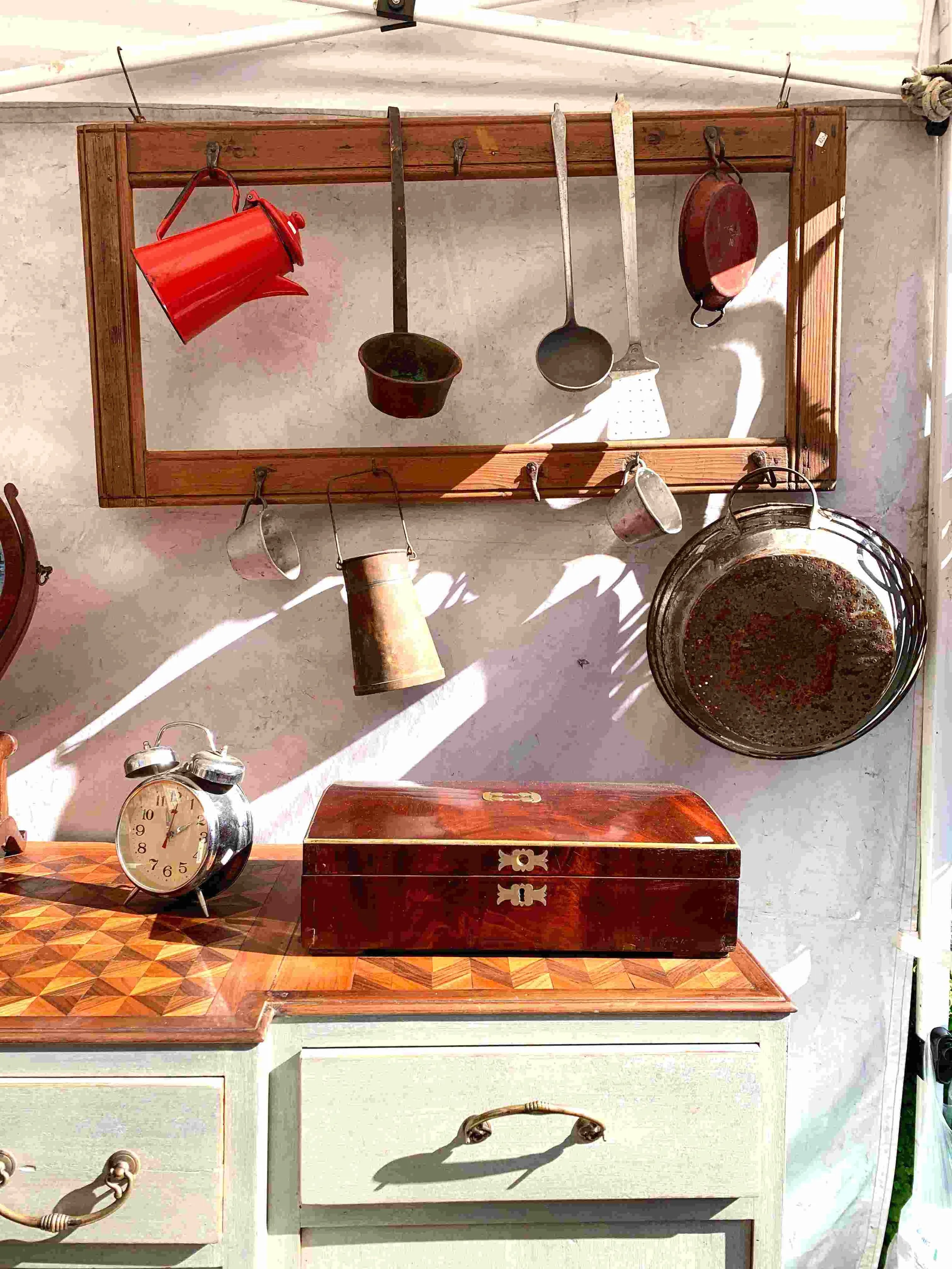 My dear friend Lili, a talented antique furniture restorer trained in Florence, has been setting up a booth here for over twenty years. From her workshop studio in the countryside of Campania, she drives 300 kilometers each month to display her collection of restored furniture, decorative objects, and other unique finds from all over Italy. Under the tent is a museum of furniture, objects, and memorabilia waiting to come back to life in its new home!