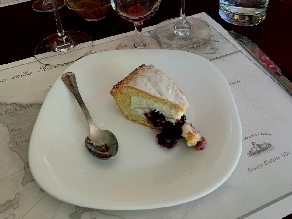 最初のコースはラビオリのパスタ、続いて地元イノシシのラグー、爽やかなルッコラのサラダ、そして庭で採れた野生のチェリーを使った自家製リコッタ・トルテ。 食事に合わせた4種類のワインは、又もや爽やかでバブリーなスプマンテで始まり、パスタにはアレアティコ種のロザートRosato 、肉料理のラグーにはどっしり感のあるヴィ・カーヴ・マルベックhttps://www.antinori.it/en/vino/vie-cave-en/ 、そしてデザート・ワインはアレアティコ種のアレアティコ・スーペリオーレ Aleatico Superiore。 最後はもちろん、濃いダブル・エスプレッソで。