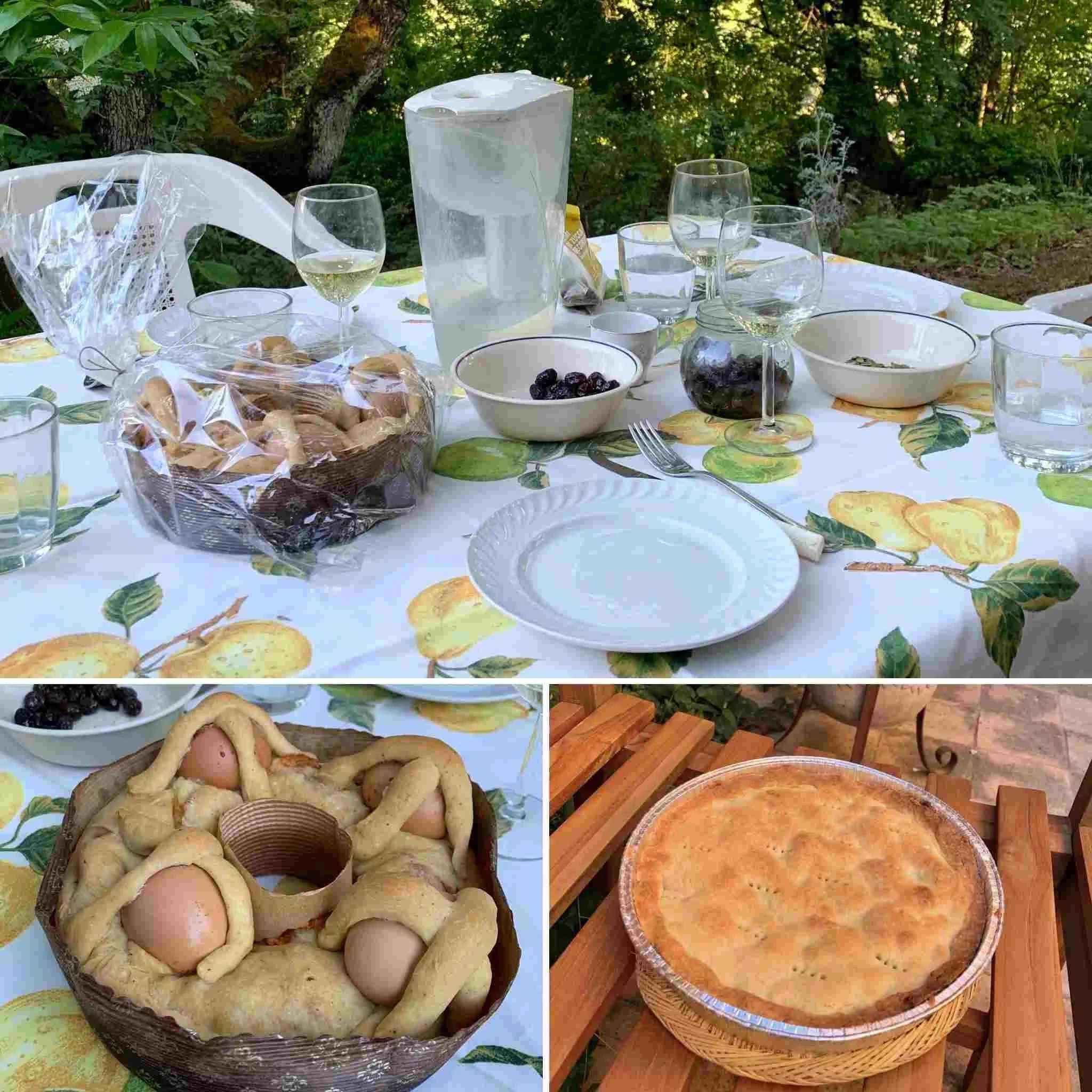 On the table shown is bread ring with boiled eggs, which Anna bought from Rome, a local specialty from Campania region where she is from. Next to it is an apple tart with almonds, which I made from my Mom’s favorite cookbook. It is a fool proof recipe that I can even bake it with my eyes closed. The main dinner - it was too dark to take the photos outside, but it consisted of hearty lentil soup, big salad and lots of olives and pecorino cheese. And of course, few bottles of local wine.